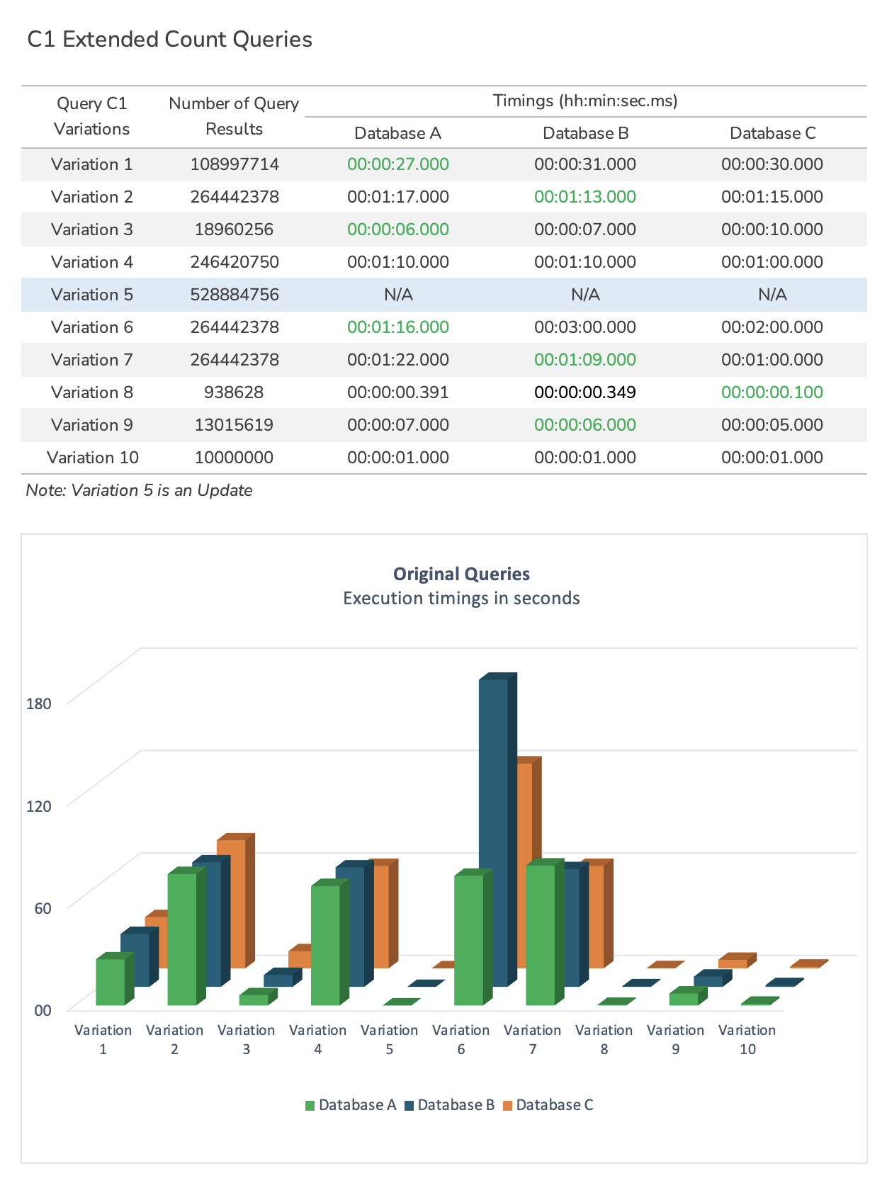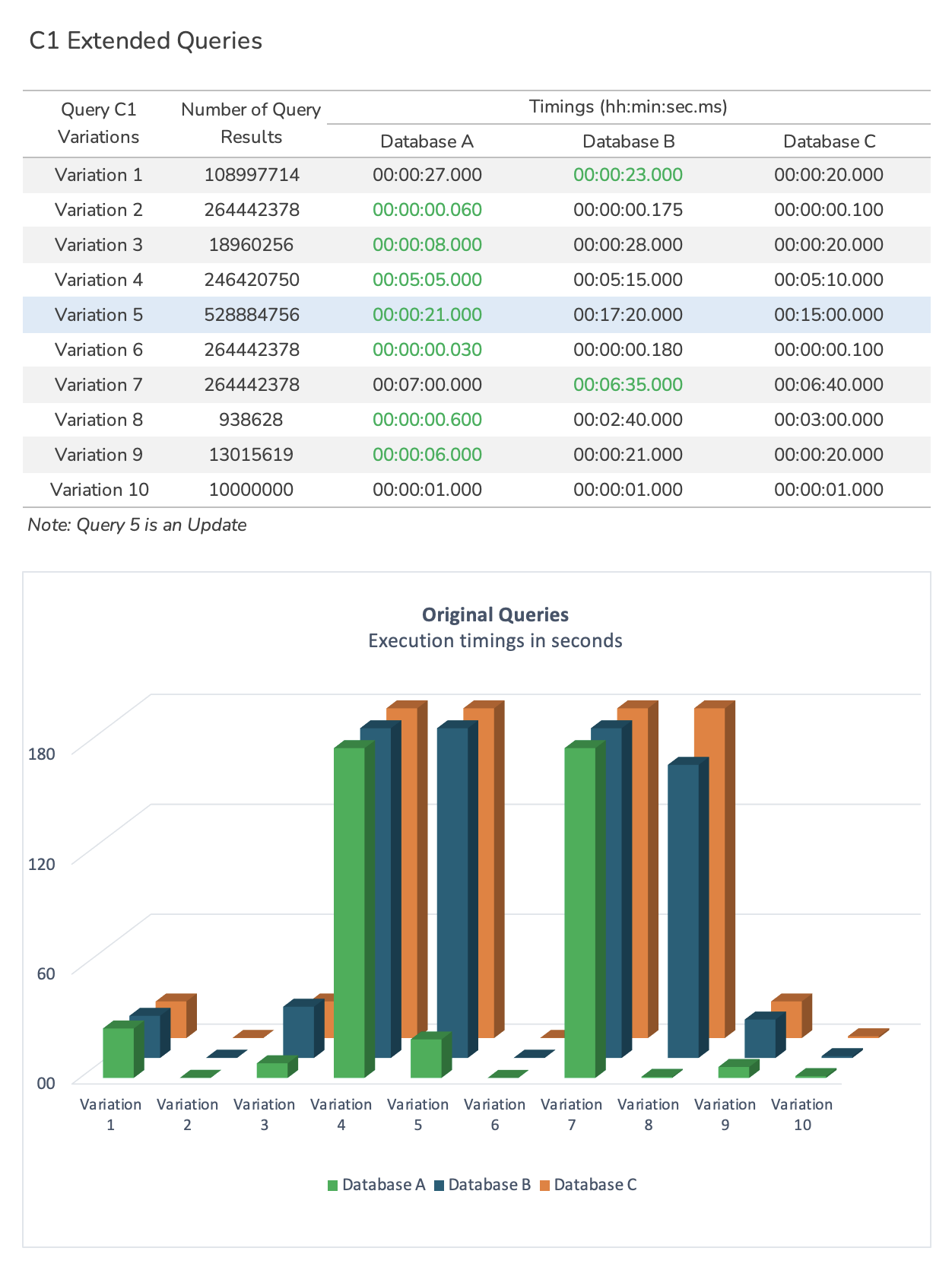 Benchmark Results¶ The benchmark will produce results like in the sample below. Loading Data¶ C1 Extended Query Timings¶ C1 Count Query Timings¶